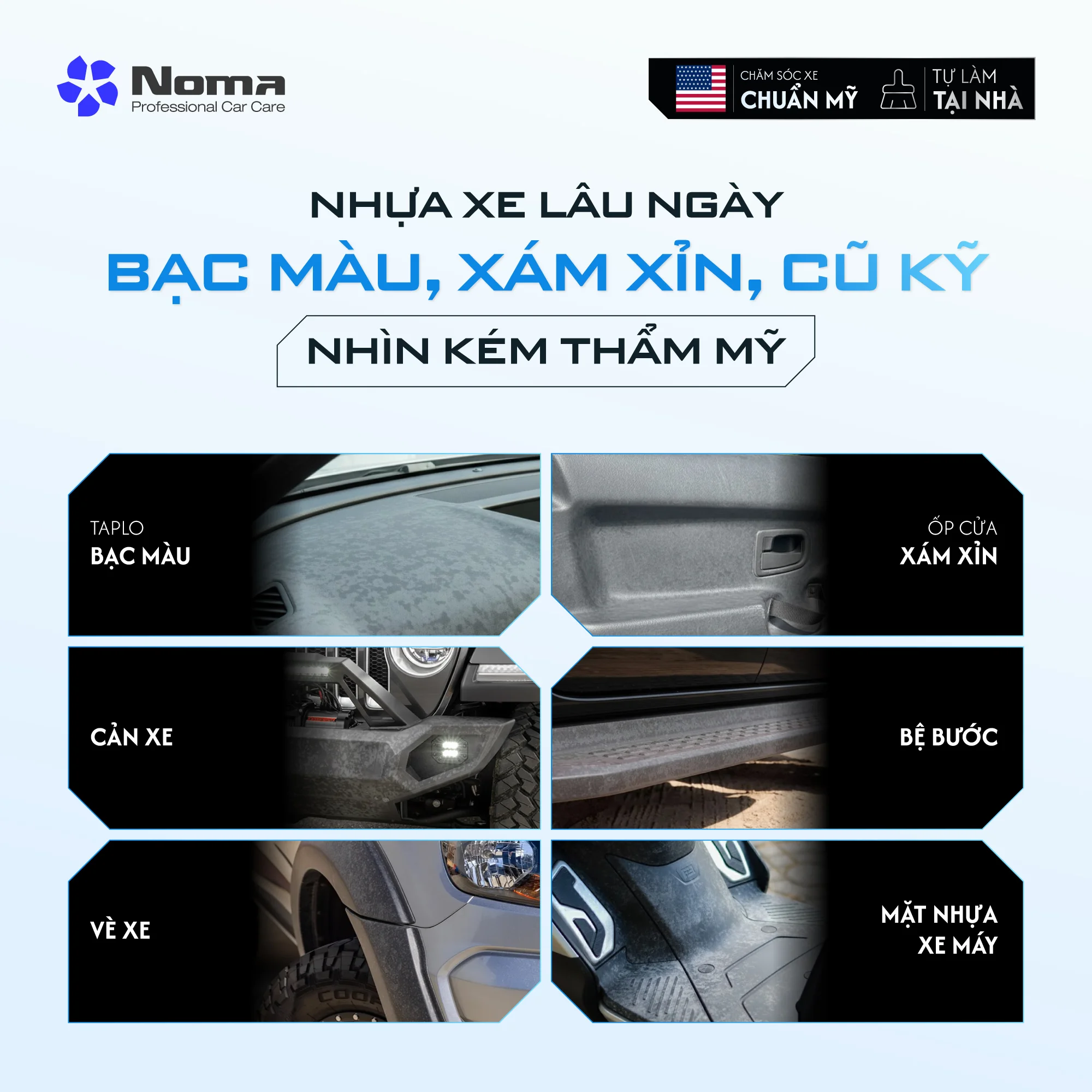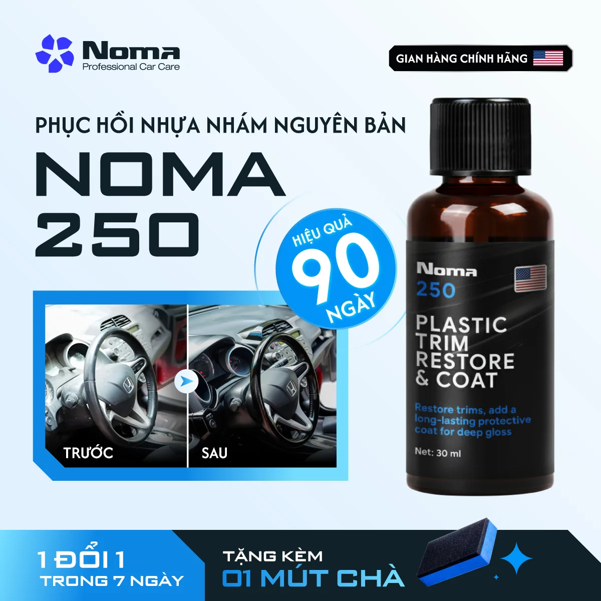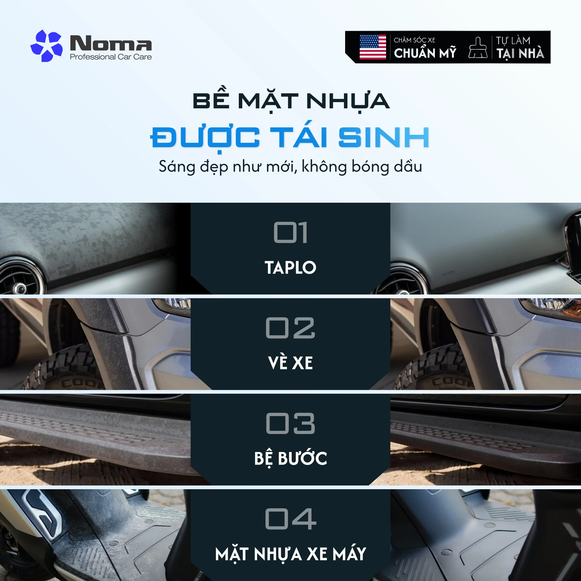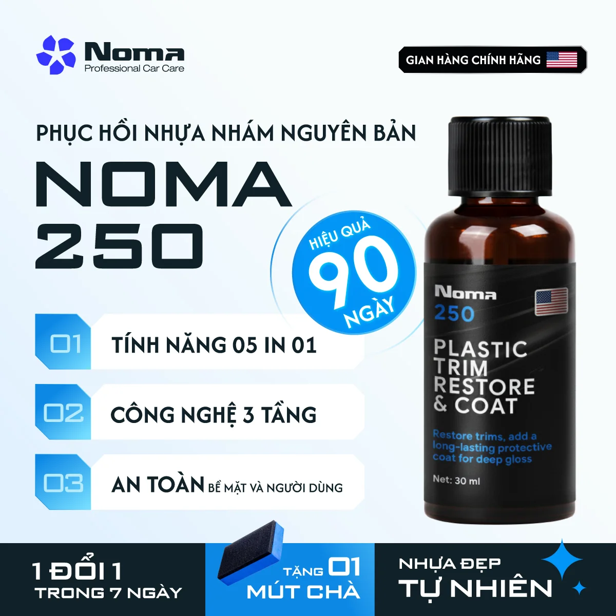 NOMA 250 là sản phẩm chăm sóc xe chuyên nghiệp thuộc thương hiệu Mỹ, được thiết kế đặc biệt để phục hồi nhựa nhám nguyên bản trên xe ô tô và xe máy đã bị bạc màu, xám xịt do tác động của thời tiết và tia UV. Dung dịch tạo nên một lớp phủ trong suốt, giúp khôi phục màu đen tự nhiên, tăng cường độ bóng, đồng thời bảo vệ lâu dài khỏi các yếu tố gây hại từ môi trường, giúp chiếc xe lấy lại vẻ ngoài sạch bóng, đen như mới mua.