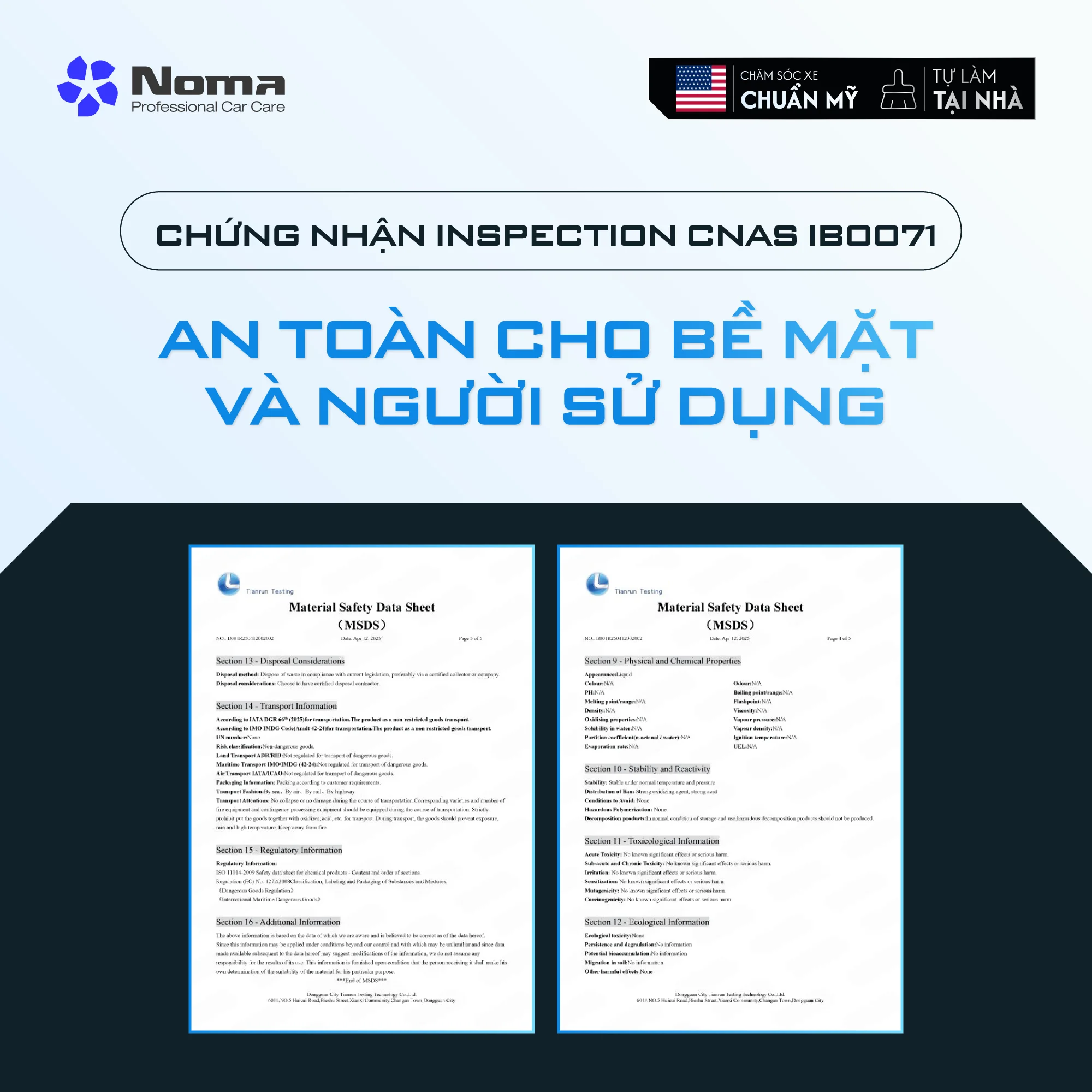 Sản phẩm cam kết AN TOÀN CHO BỀ MẶT VÀ NGƯỜI SỬ DỤNG với CHỨNG NHẬN INSPECTION CNAS I80071. Sự đảm bảo này mang lại sự yên tâm tuyệt đối khi sử dụng NOMA 250 để phục hồi các chi tiết nhựa nhám trên xe.