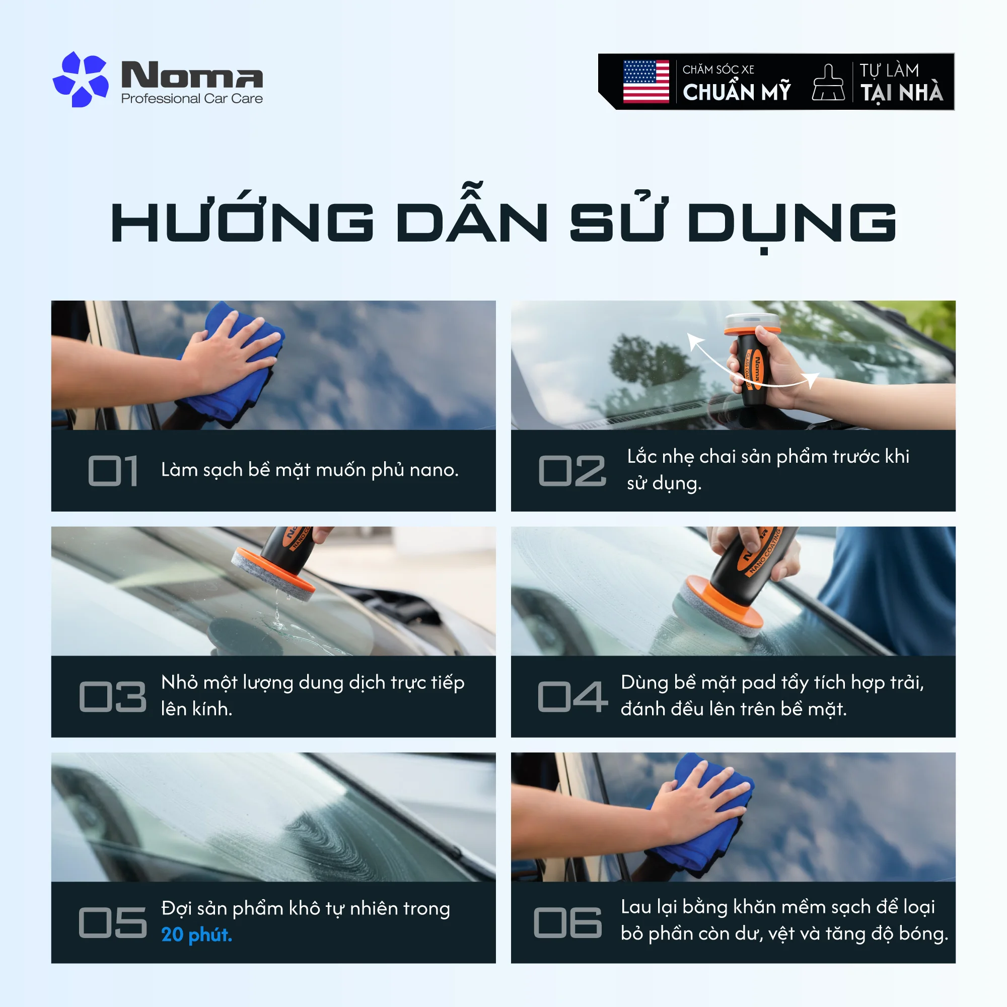 Để đạt được lớp phủ bền bỉ và hiệu ứng trượt nước tốt nhất, bạn hãy thực hiện theo quy trình 6 bước đơn giản sau đây: