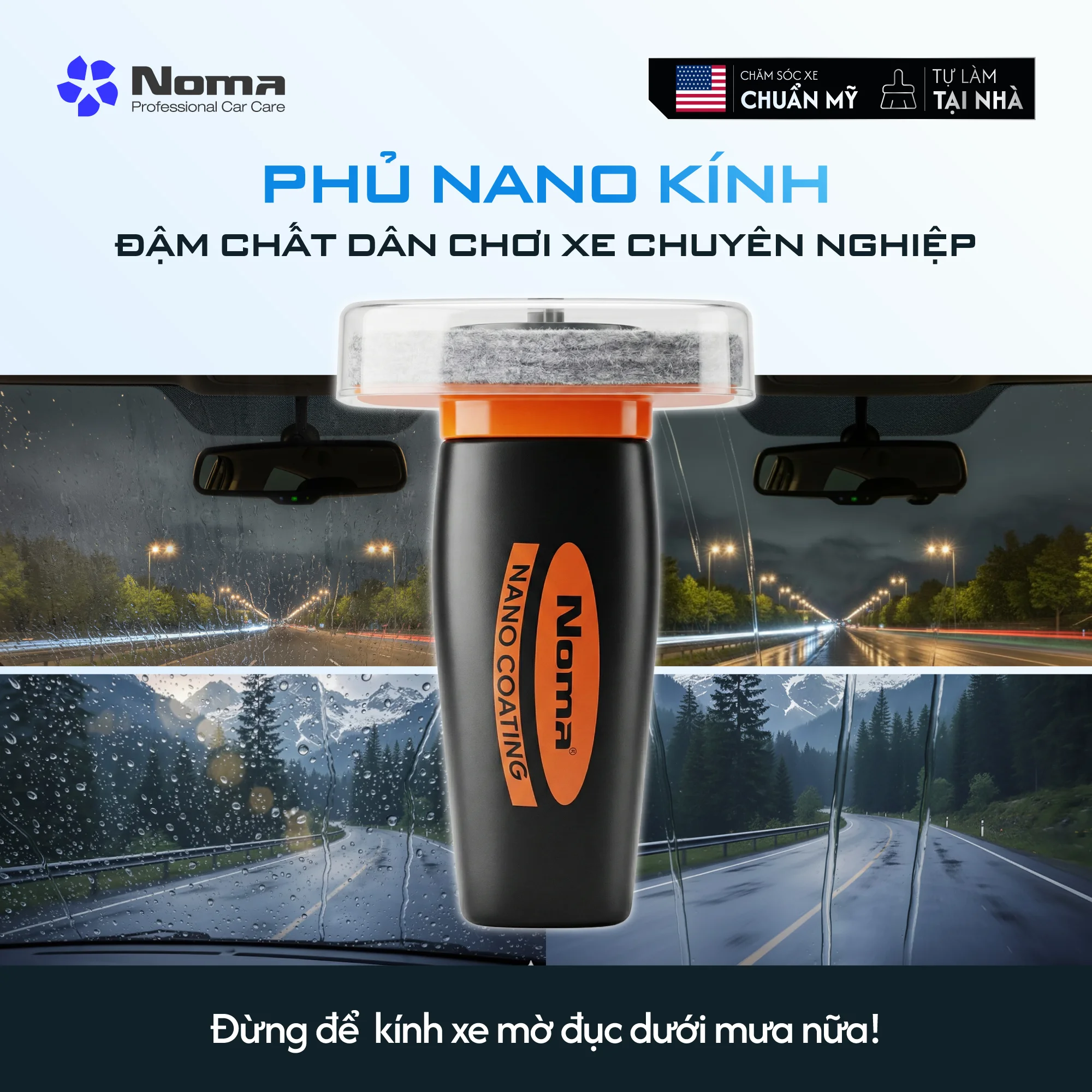 Mưa lớn bám nhòe, nước đọng thành màng trên kính khiến việc lái xe trở nên nguy hiểm và khó khăn? Giải pháp tối ưu chính là NOMA 922 – Dung dịch phủ nano kính xe an toàn. Khác biệt với các dòng bảo vệ kính cơ bản, NOMA 922 tạo ra một lớp phủ kỵ nước từ công nghệ nano tiên tiến, giúp ngăn nước bám và tự làm sạch bề mặt kính hiệu quả. Chỉ với vài bước tự làm tại nhà, kính xe của bạn sẽ đạt được độ trong suốt, độ bóng sâu và duy trì hiệu quả bảo vệ bền lâu lên đến 5 tháng.