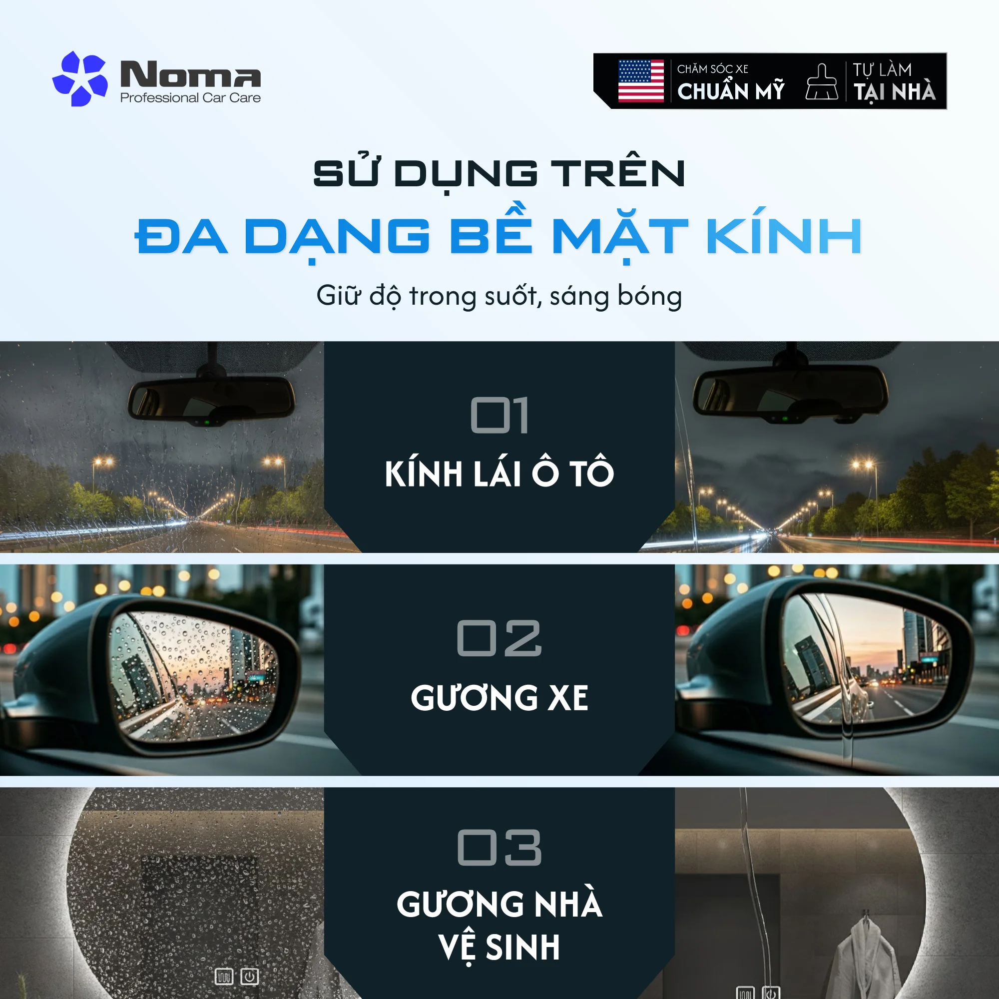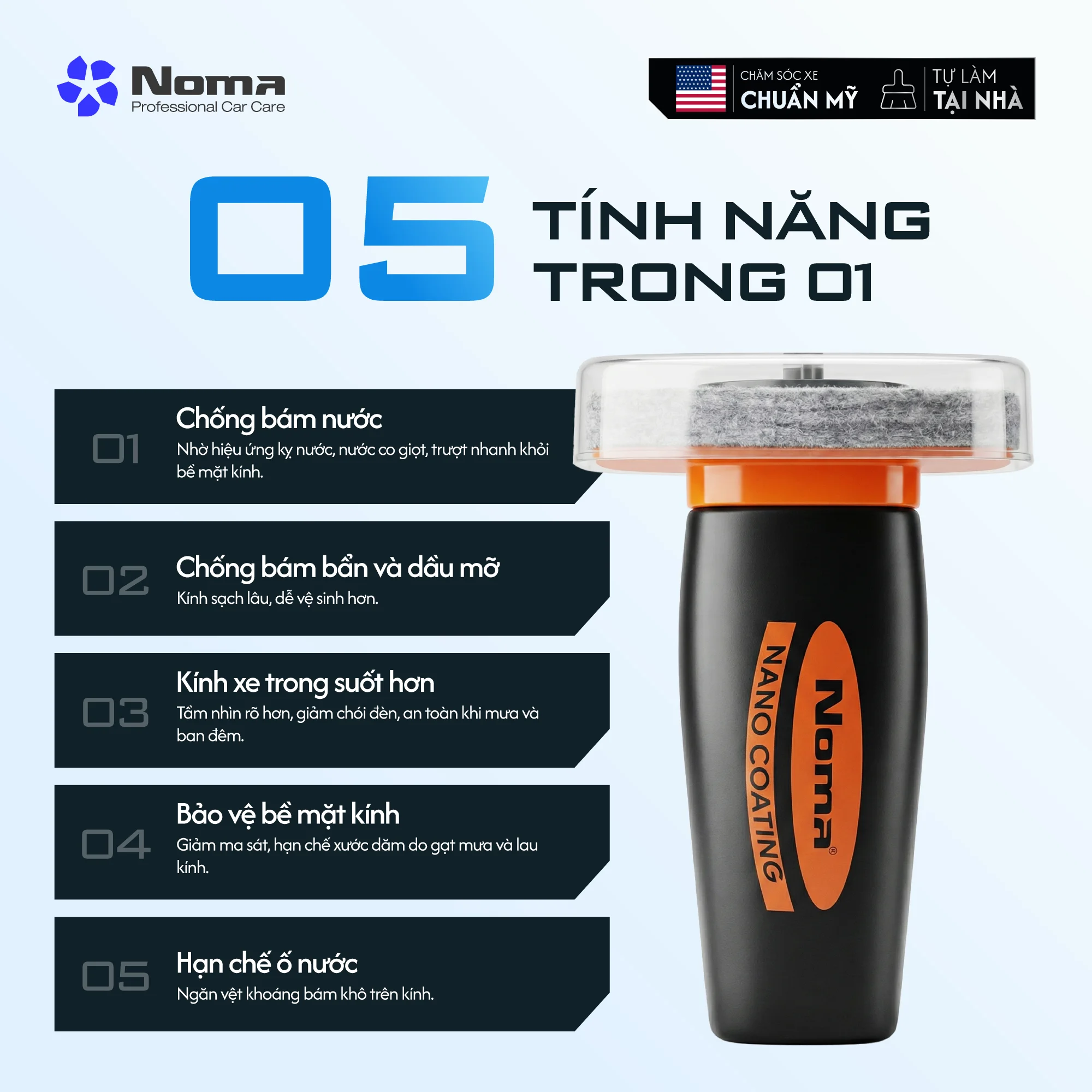 • Bảo vệ bền bỉ: Phủ Noma 922 ngay sau đó giúp tăng cường khả năng trượt nước và giữ kính luôn trong suốt.