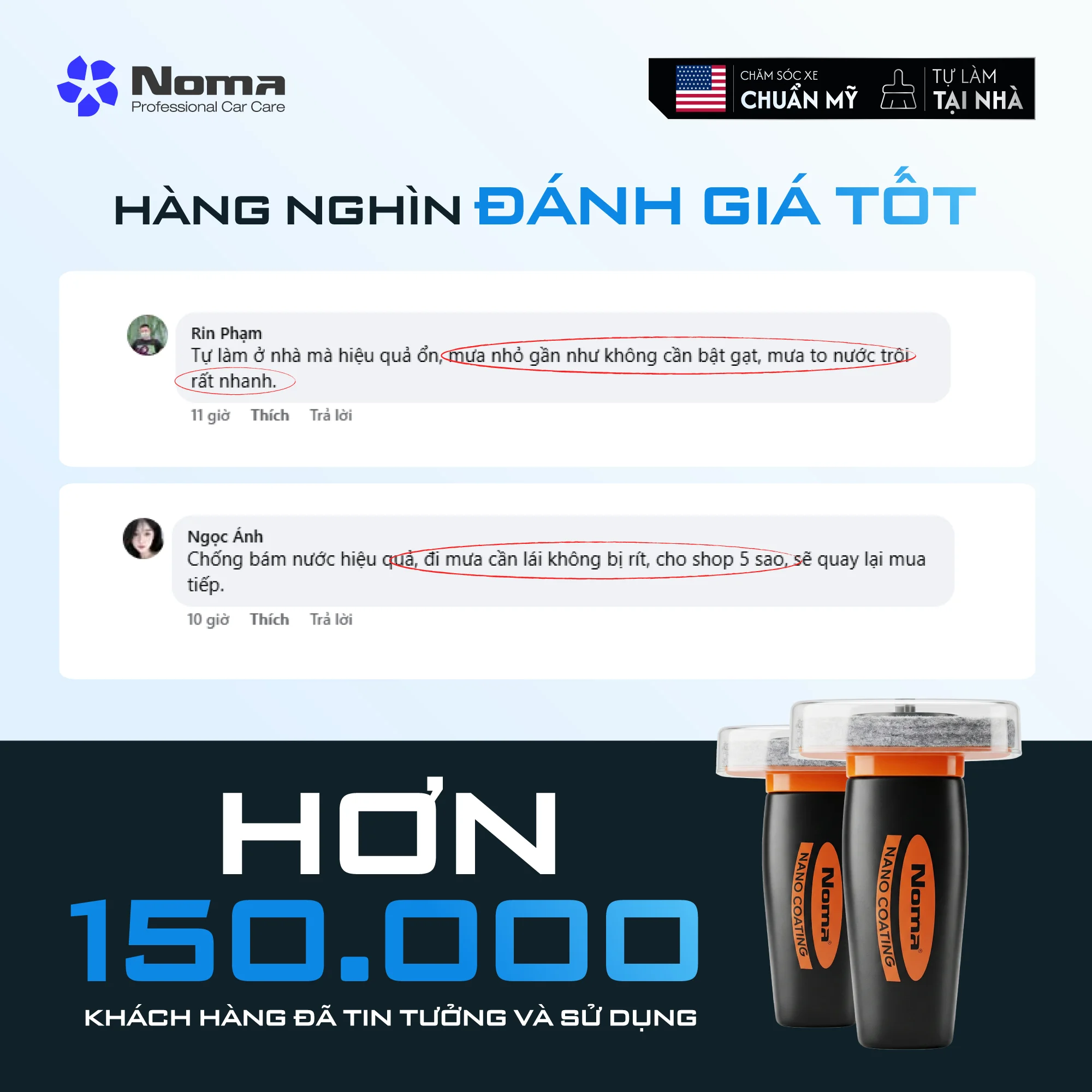 Với hơn 150.000 khách hàng tin tưởng sử dụng, NOMA 922 đã khẳng định được chất lượng vượt trội qua những phản hồi thực tế. Người dùng đánh giá cao khả năng trượt nước nhanh khi mưa lớn và thậm chí không cần sử dụng cần gạt khi mưa nhỏ. Đặc biệt, lớp phủ nano giúp quá trình lái xe dưới mưa trở nên mượt mà, không gây rít cần gạt, mang lại trải nghiệm an toàn và thoải mái. Đây là minh chứng rõ nét nhất cho một sản phẩm chăm sóc xe chuẩn Mỹ mà bạn có thể tự làm tại nhà với hiệu quả chuyên nghiệp.