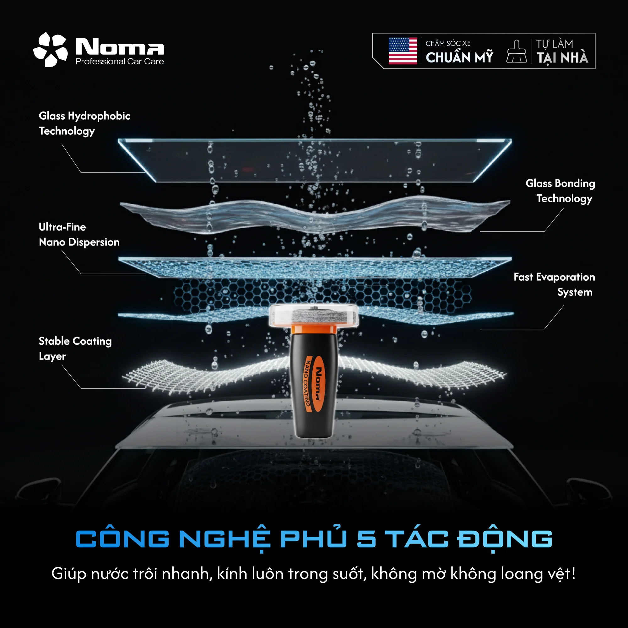 NOMA 922 ứng dụng hệ thống đa tầng giúp nước trôi nhanh, giữ bề mặt luôn trong suốt mà không để lại màng mờ hay loang vệt. Sự kết hợp giữa Glass Hydrophobic Technology (công nghệ kỵ nước) và Glass Bonding Technology (liên kết bề mặt) tạo nên lớp phủ ổn định, bền bỉ trước mọi điều kiện thời tiết. Hệ thống bay hơi nhanh (Fast Evaporation System) giúp tối ưu thời gian thực hiện, nhanh chóng hình thành mạng lưới nano mịn bảo vệ kính. Đây chính là giải pháp công nghệ hiện đại mang lại hiệu quả vượt trội, giúp bạn hoàn toàn yên tâm cầm lái dù trong những cơn mưa lớn.