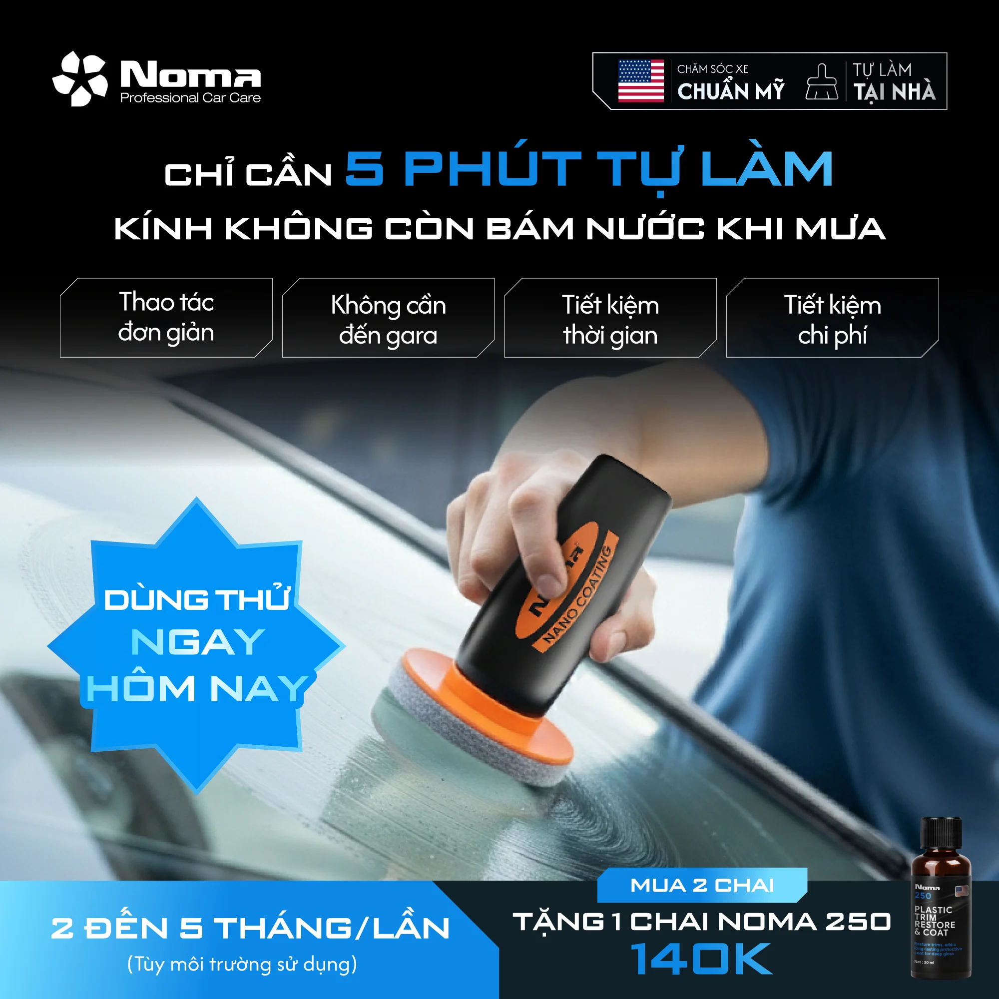 Sở hữu khả năng chống bám nước chuyên nghiệp chưa bao giờ đơn giản đến thế với NOMA 922 ngay tại nhà. Chỉ với vài thao tác đơn giản, bạn có thể tự mình làm mà không cần đến gara, giúp tiết kiệm thời gian và chi phí bảo dưỡng. Lớp phủ nano bền bỉ duy trì hiệu quả từ 2 đến 5 tháng, đảm bảo tầm nhìn rõ nét xuyên suốt mùa mưa.
